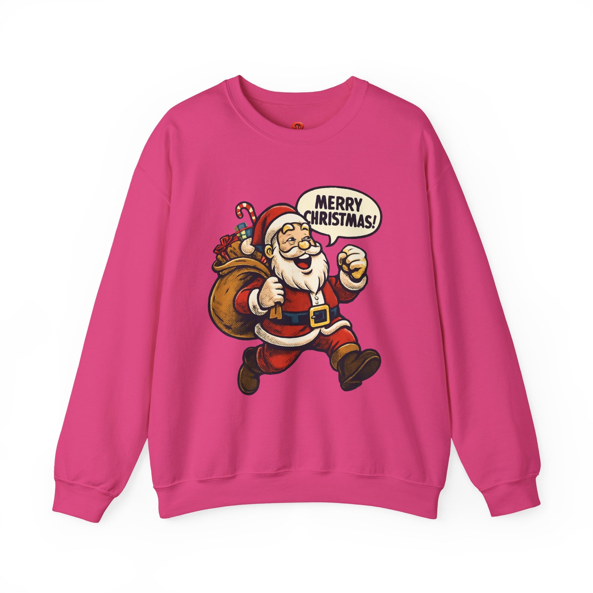 Featuring a cheerful Santa Claus carrying a festive gift bag and saying “Merry Christmas!”, this cozy crewneck is perfect for winter outfits, Christmas parties, and thoughtful holiday gifts.